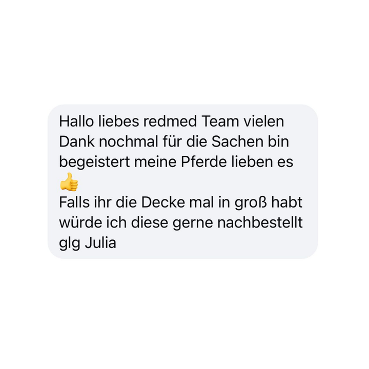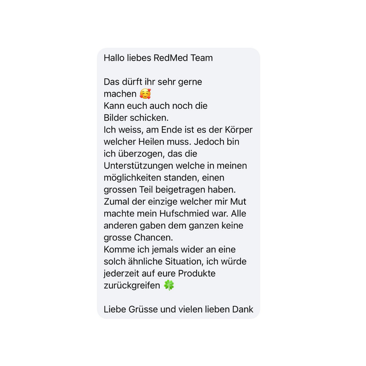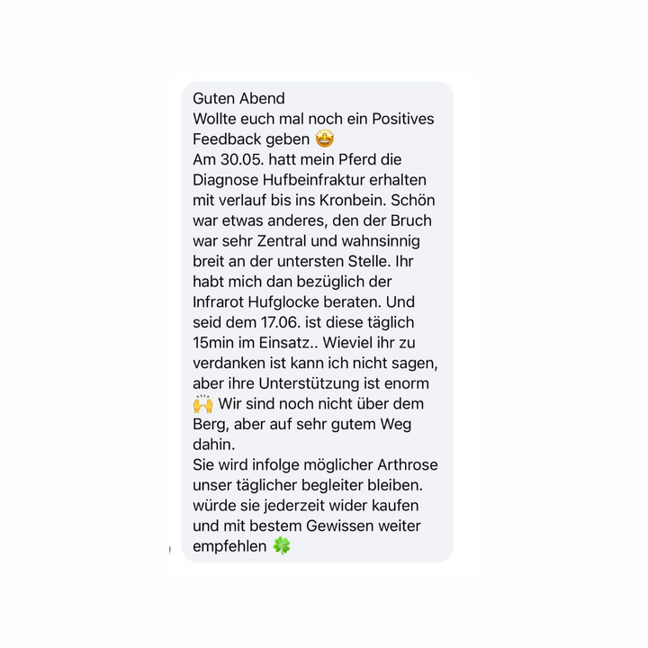 Nach der Diagnose einer schweren Hufbeinfraktur gab es wenig Hoffnung. Dank täglicher Anwendung der RedMed Infrarot-Hufglocke, der Unterstützung meines Hufschmieds und viel Vertrauen in die Regenerationskraft des Körpers ist mein Pferd heute klar auf dem Weg der Besserung. Die Hufglocke bleibt für uns ein fester Bestandteil im Alltag – auch mit Blick auf mögliche Arthrose. Ich würde sie jederzeit wieder kaufen und uneingeschränkt weiterempfehlen.
