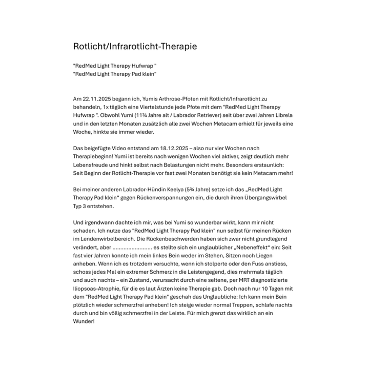 Seit dem 22.11.2025 behandle ich die Arthrose-Pfoten meiner Labradorhündin Yumi (11¾ Jahre) täglich 15 Minuten pro Pfote mit dem RedMed Light Therapy Hufwrap. Bereits nach vier Wochen (18.12.2025) war sie deutlich aktiver, zeigte mehr Lebensfreude und hinkte selbst nach Belastungen nicht mehr. Besonders beeindruckend: Seit Beginn der Lichttherapie braucht sie kein Metacam mehr.